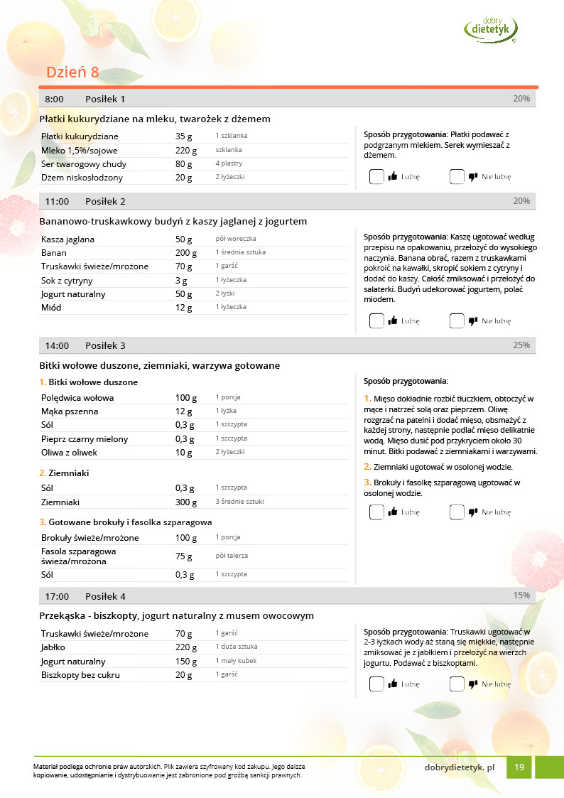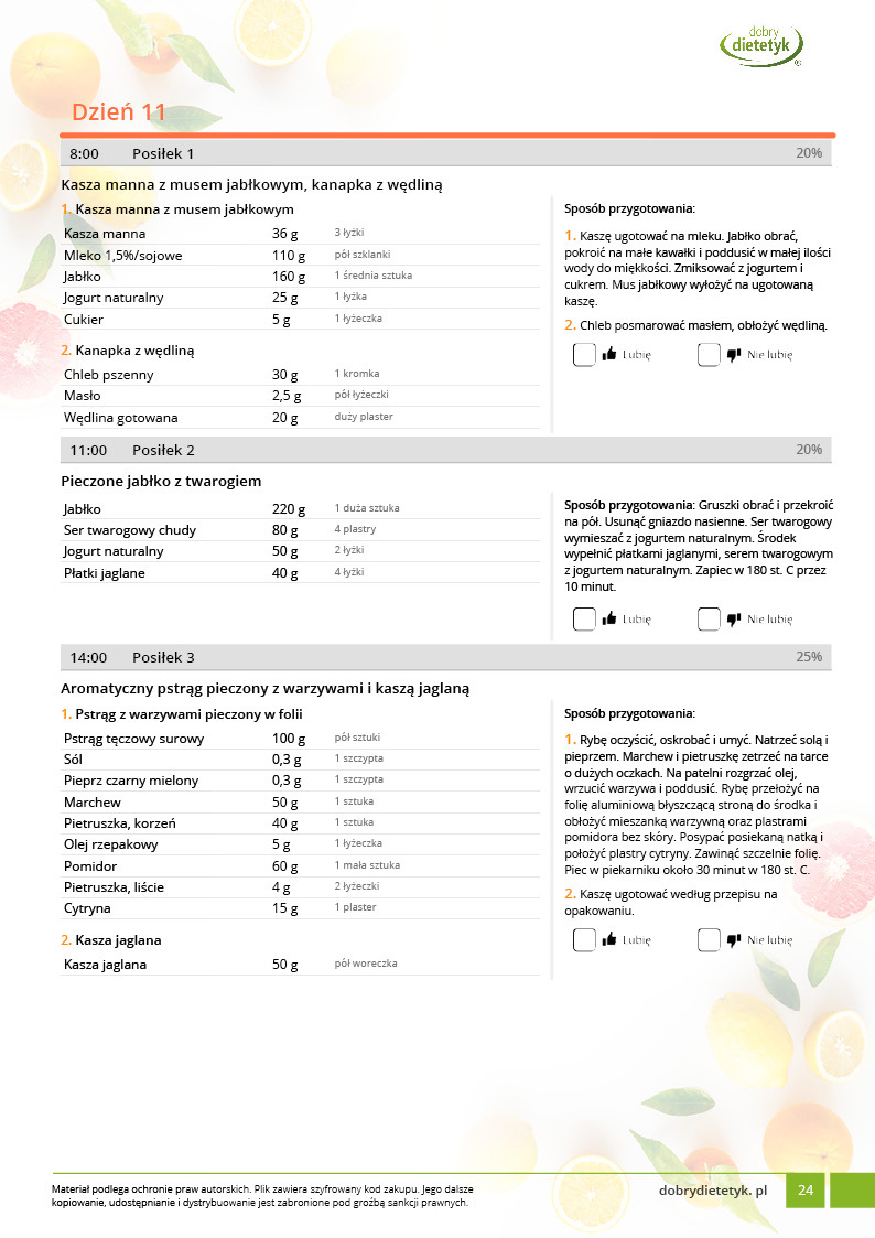 • w formie precyzyjnych jadłospisów wielodniowych (na każdy dzień miesiąca jest opracowany osobny jadłospis). Tutaj nie musisz zastanawiać się co zjeść każdego dnia, gdyż będziesz mieć dokładnie wszystko rozplanowane.