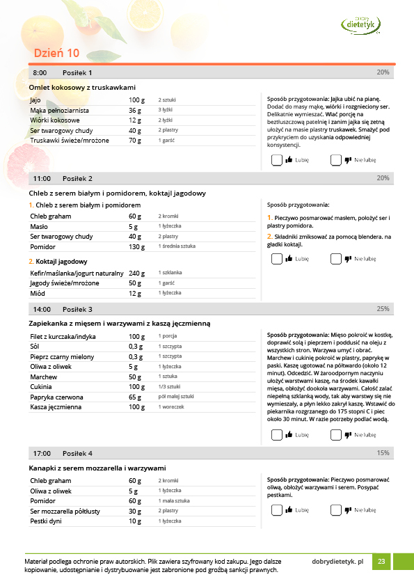 w formie propozycji posiłków (zamiast pojedynczych jadłospisów jednodniowych, przygotowano propozycje kilku propozycji dań na każdy posiłek). Tutaj nie uzależniamy Cię od tego jakie masz np. w danym dniu zjeść śniadanie czy obiad, tylko sam wybierasz sobie ulubione danie z kilku przedstawionych przez nas propozycji.