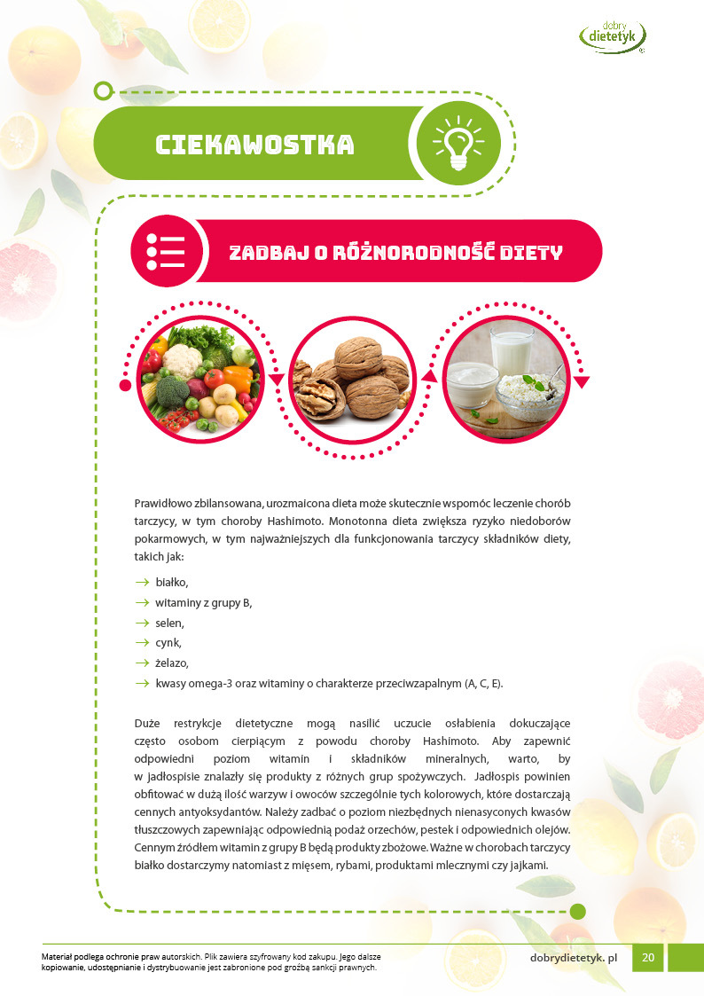 Kompleksowy program żywieniowy dla KOBIET z występującym zapaleniem tarczycy Hasimoto. Jadłospis opracowany został na 30 dni z myślą o wsparciu pracy tarczycy oraz redukcji masy ciała. Dieta nie zawiera pszenicy oraz laktozy, zawiera mniejszą ilość produktów zawierających gluten oraz produktów mlecznych. Z powodzeniem można w razie potrzeby zamienić je na produkty bezglutenowe np. pieczywo gryczane. Poprzez odpowiednie proporcje makroskładników oraz zwiększoną ilość pełnowartościowego białka dieta wspomagać może często spowolnione w wyniku zaburzeń pracy tarczycy procesy metaboliczne. Większa ilość błonnika pokarmowego zapobiega także występującym w niedoczynności zaparciom. Dodatkowo zwrócono uwagę na składniki takie jak: witaminy przeciwzapalne C i E, magnez, cynk, przeciwzapalne kwasy tłuszczowe omega-3, niezbędne nienasycone kwasy tłuszczowe oraz aminokwas tyrozynę, które mają wpływ na produkcję hormonów tarczycy.