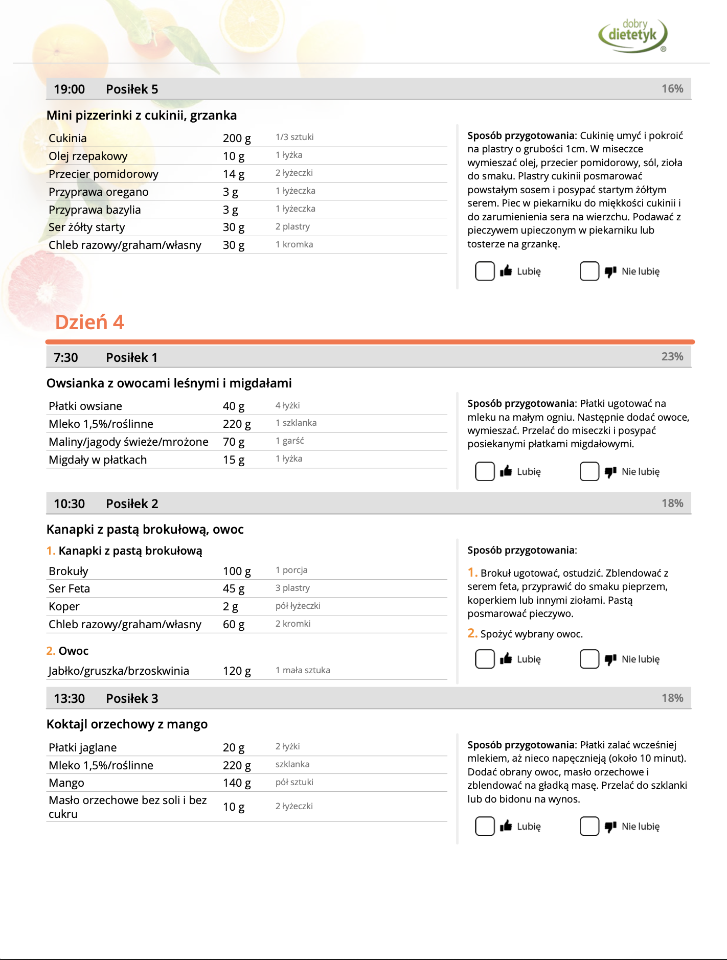 • Liczba posiłków w ciągu dnia: 5