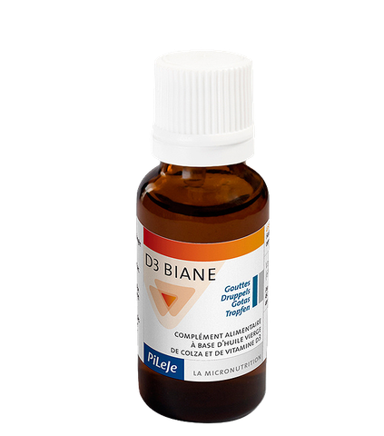D3 Biane w kroplach to suplement diety na bazie oleju rzepakowego i witaminy D3. Suplement diety zapewnia 100% dziennego zapotrzebowania w witaminę D3, która przyczynia się do utrzymania właściwej struktury kostnej i prawidłowego funkcjonowania systemu odpornościowego.Rekomendowany do suplementacji w: